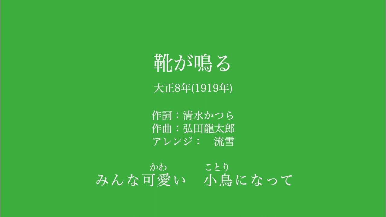 Japanese Children's Songs (日本の子供の歌 (Nihon no kodomo no uta)) 靴が鳴る (Kutsu ga naru) lyrics: お手(てて)つないで 野道を行(ゆ)けば / みんな可愛(かわ)い 小鳥になつて / 歌をうたへば 靴が鳴る / 晴れたみ空に 靴が鳴る / 花.. デジタル大辞泉プラス - 靴が鳴るの用語解説 - 日本の唱歌の題名。作詞:清水かつら、作曲:弘田龍太郎。発表年は1919年。2007年、文化庁と日本PTA全国協議会により「日本の歌百選」に選定された。